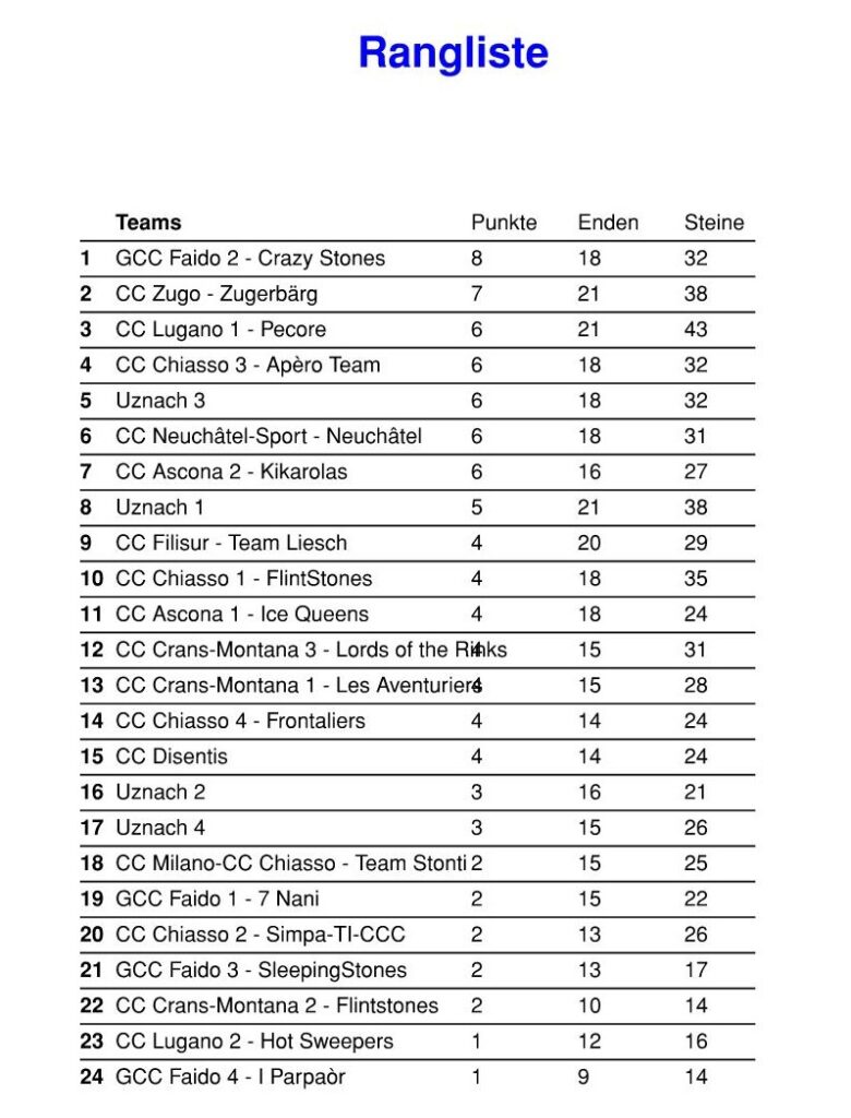 In der Runde 2 ging es ähnlich weiter Uznach 3 mit Markus Rüttimann, Piri Keller, David Umher und Thomas Mäder wussten mit 9:3 gegen Crans-Montana 1 zu überzeugen. Uznach 2 konnten ihre spielerische Überlegenheit nicht nutzen und verloren gegen Neuchatel-Sports mit 7:9 Zähler. Gegen Uznach 1 hatte Chiasso 3 nichts auszurichten. Die St. Galler blieben mit 11:1 ungefährdet. Uznach 4 hatte gegen Faido 1 wohl nicht ihre besten Längen ausspielen können und musste mit 4:6 vom Eis. Das Fazit: zwei Mannschaften durften die Morgenrunde schon um 8:00h beginnen und für zwei Teams gab es das Morgenessen etwas später.